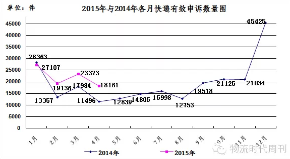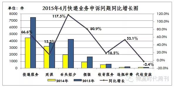 2015年4月,受理消费者关于快递业务的有效申诉18161件,环比下降22.3%,同比增长58%。
