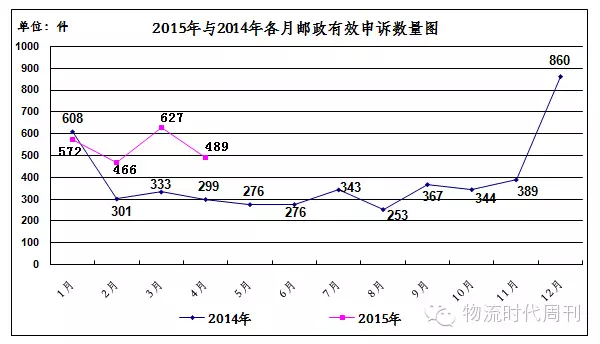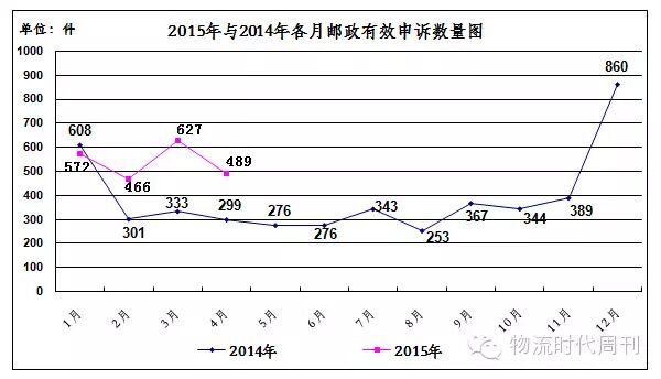 2015年4月,受理消费者关于邮政服务问题的有效申诉489件,环比下降22%,同比增长63.5%。