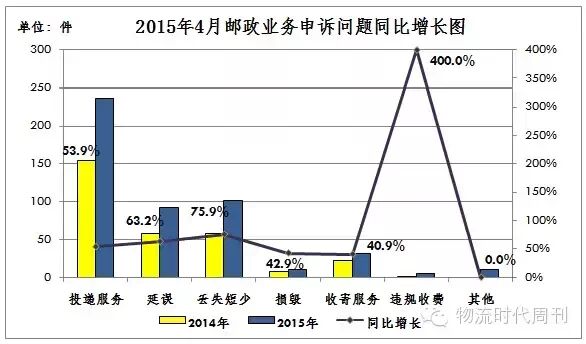 2015年4月,邮政业务的各项服务问题同比均呈增长趋势;邮件丢失短少、邮件延误和投递服务问题同比增幅较大,分别增长75.9%、63.2%和53.9%。