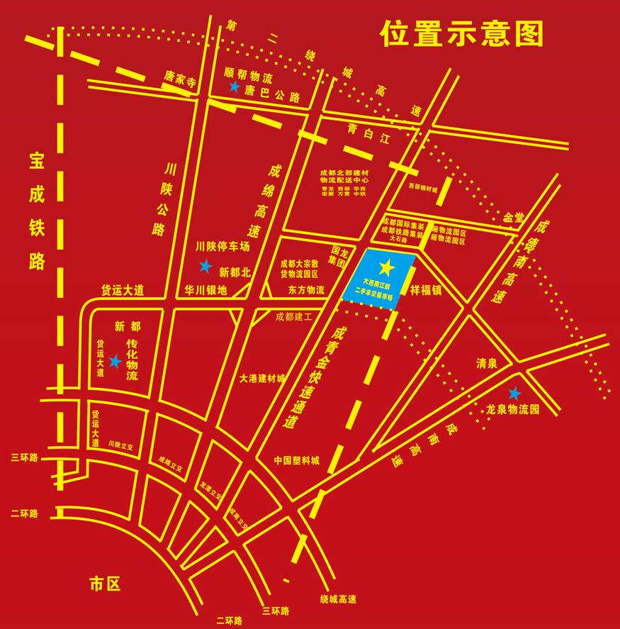 市场位于青白江区福镇成青快速与货运大道交汇处,地处青白江、新都、金堂中心位置,距成绵高速、成青快速路出口(新都北)4公里,距青白江国际铁路港2公里,距第二绕城高静青白江站5公里,距第二绕城高速金堂站6公里,距成德南高速青白江出口12公里。交通十分便利,区位优势明显,是从事二手车交易商家的理想之地。