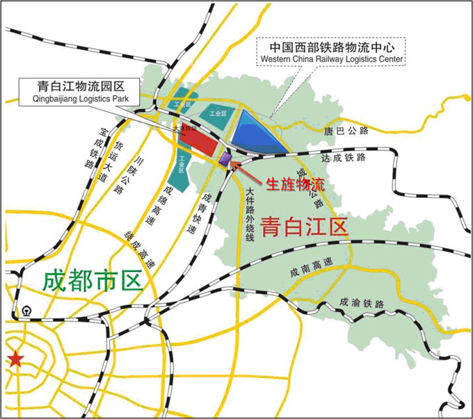 成都市“北改工程货运市场外迁”重点建设项目,由原川陕路大西南生旌物流中心整体搬迁至青白江祥福镇青白江大道1118号,项目占地300余亩,总投资4.2亿元。大西南货运集散中心/成都青白江公路货运集散中心(原大西南生旌物流中心)的总体发展目标是:按照“定位高起点、规划高标准、设计高规格”的要求,将大西南货运集散中心建设成为模式新颖、管理先进、布局科学、设施完善、环境优良,集“公铁联运、城际专线、零担仓储、商务办公、停车住宿、货运交易、信息平台、货运保险、物流金融”等功能于一体,立足成都,服务四川,辐射西部,联系全国的国家公路货运枢纽型物流中心与物流信息电子交易平台。